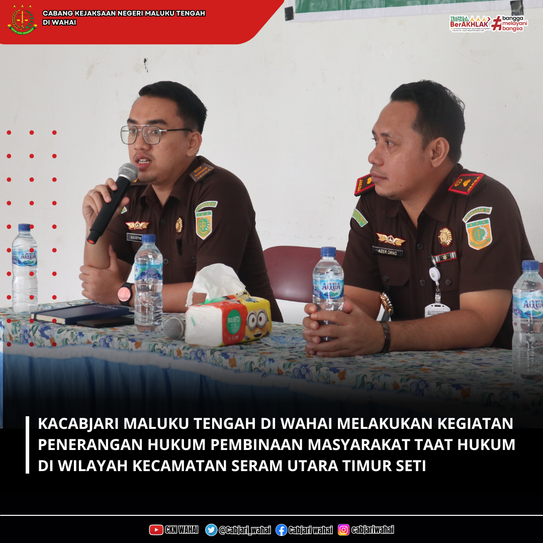 Jumat 08 Maret 2024, Kepala Cabang Kejaksaan Negeri Maluku Tengah di Wahai melaksanakan kegiatan Penerangan Hukum Pembinaan Masyarakat Taat Hukum di Wilayah Kecamatan Seram Utara Timur Seti yang dilaksanakan di Balai Negeri Kobisonta, Kecamatan Seram Utara Timur Seti, Kabupaten Maluku Tengah.