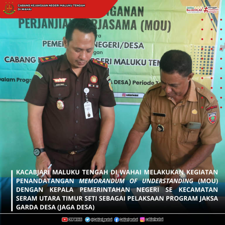 Kacabjari Maluku Tengah Di Wahai Melakukan Kegiatan Penandatangan Memorandum Of Understanding (Mou) Dengan Kepala Pemerintahan Negeri Se Kecamatan Seram Utara Timur Seti Sebagai Pelaksaan Program Jaksa Garda Desa (Jaga Desa)